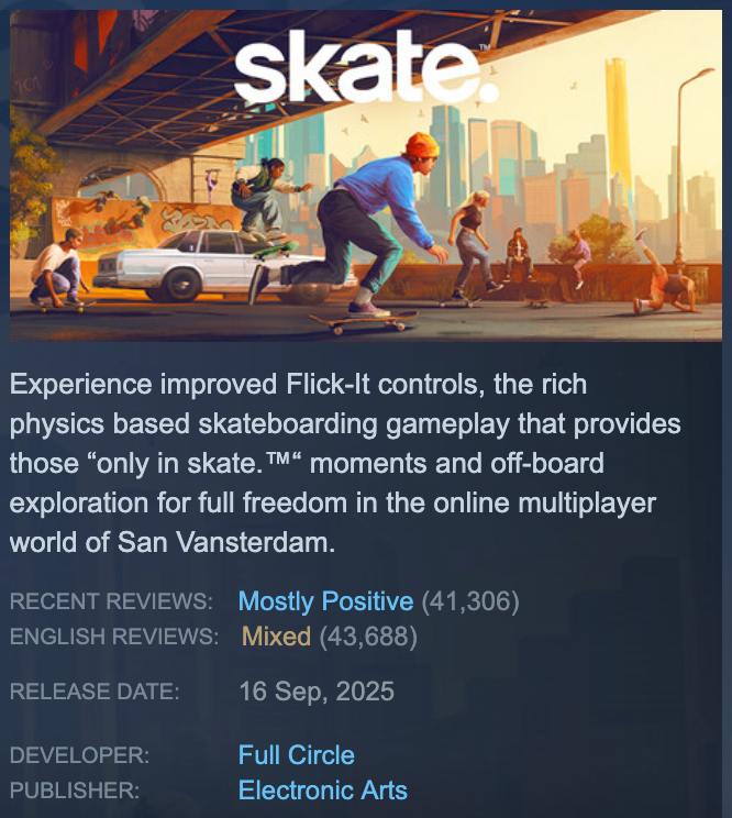 skate. proves that a legacy franchise will sacrifice the depth of its progression and the universal accessibility of its platform in favor of a profit-first, live-service model. Its forced multiplayer structure and curated content model result in a toxic mix of server friction and digital isolation. The player may pay $0 to start, but the game is fundamentally designed to erode the value of the player's time until they pay to feel really any sense of reward or acquire meaningful cosmetics.